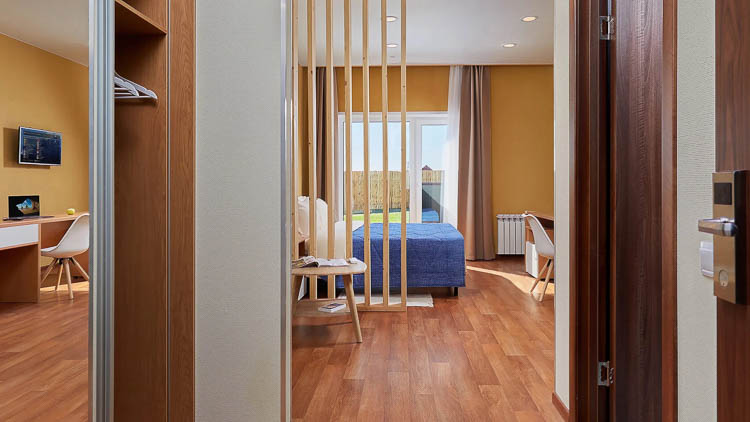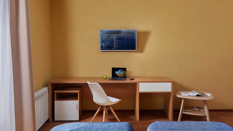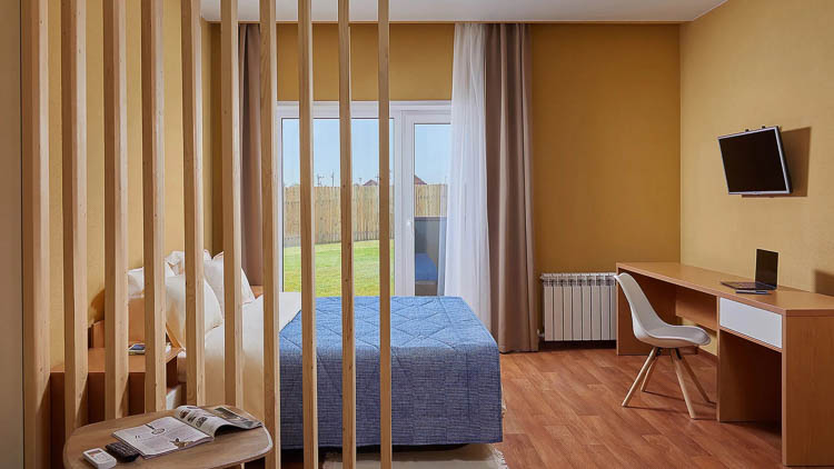 В каждом номере имеется современная удобная мебель (раздельные кровати, диван, прикроватные тумбочки, стулья, табуретки, шкаф для одежды, зеркало, письменный стол, журнальный столик), телевизор, санузел с душем, фен и холодильник.
